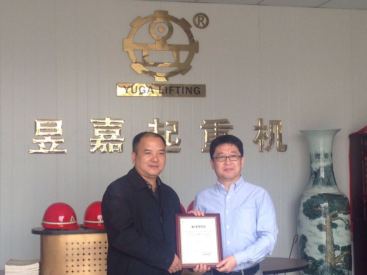 凱道起重設(shè)備(上海)有限公司技術(shù)部村松部長(zhǎng)(右)為廣東昱嘉起重機(jī)KITO指定售后服務(wù)商授牌